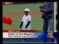Description: March of Dimes National Ambassador, 7-year-old Zeek Taylor does what Cincinnati Mayor Mark Mallory couldn't do—put the first pitch over the plate! Zeek's on tour promoting participation in WalkAmerica to save babies from premature birth. Courtesy of WLWT |
